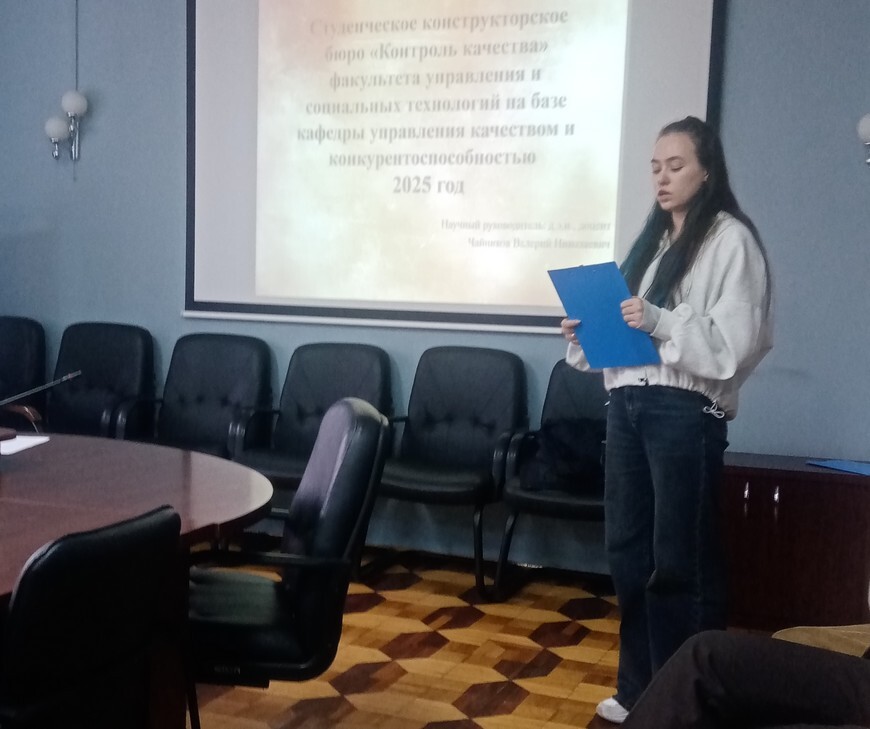 Член студенческого констукторского бюро «Контроль качества» обучающаяся группы ЗУП-53-24 Тимофеева Карина принимала участие в конкурсе грантов «Лучший проект студенческого конструкторского бюро ФГБОУ ВО «ЧГУ им. И.Н. Ульянова». В своем выступление она представила проект «Разработка региональной системы добровольной сертификации продукции и услуг на примере Чувашской Республики», где было отмечено, что актуальность этой работы заключается в необходимости создания системы, отвечающей за безопасность продукции для человека и окружающей среды, а также рассказала о цели, задачах и значимости проекта.