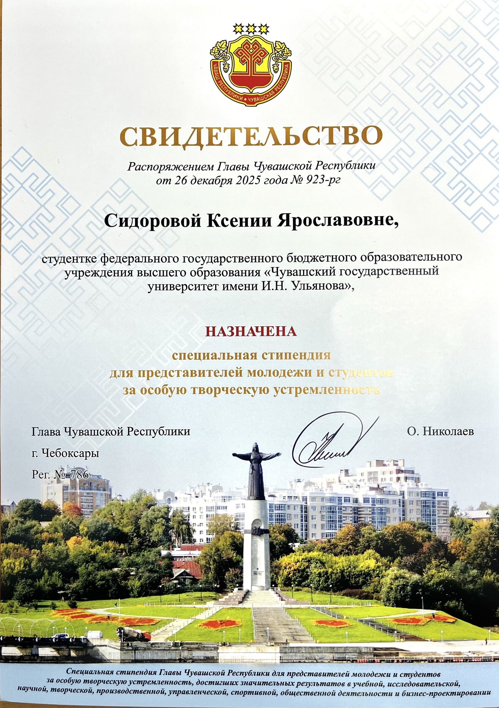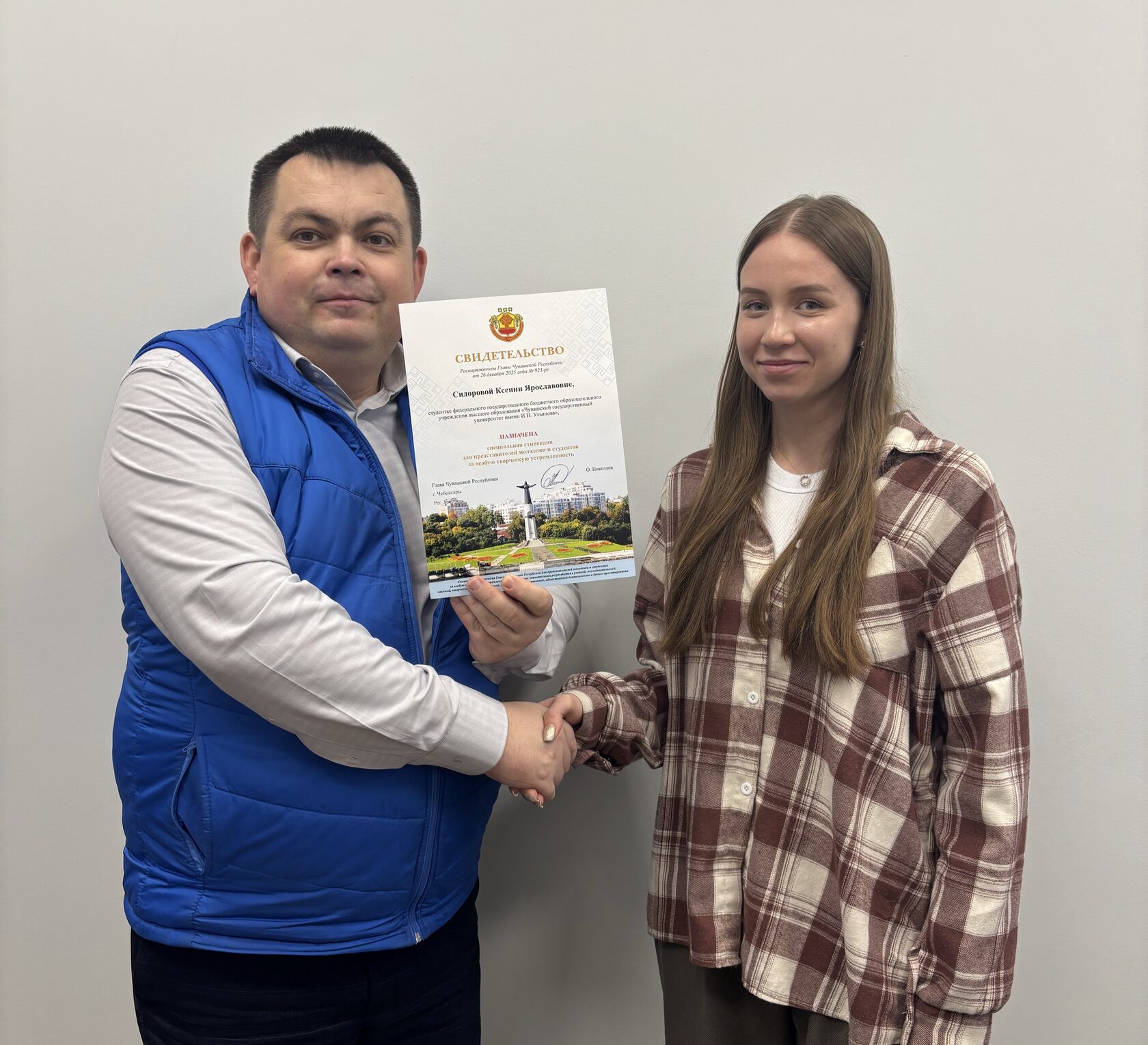 Студентке нашего факультета, Ксении Сидоровой из группы УП-41-25, по распоряжению Главы Чувашской Республики назначена специальная стипендия для представителей молодёжи и студентов за особую творческую устремленность.